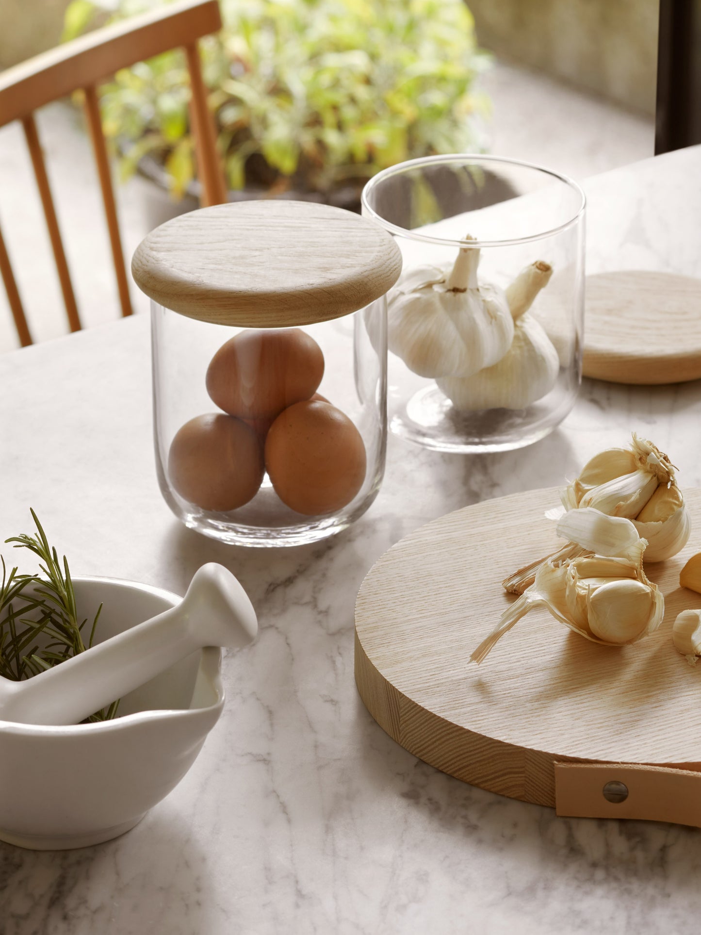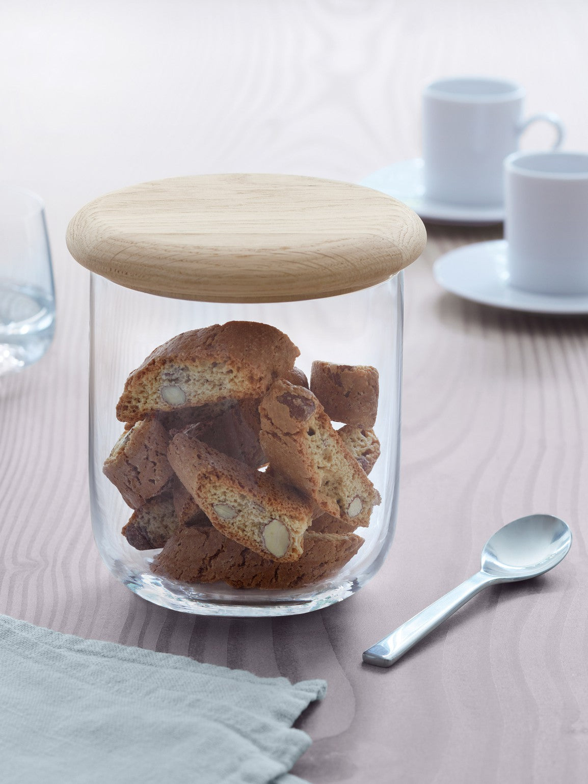 A mouth-blown glass container with wooden lid, made from FSC-certified natural oak by LSA. Suitable for storage and display in the kitchen, bathroom, bedroom or office.